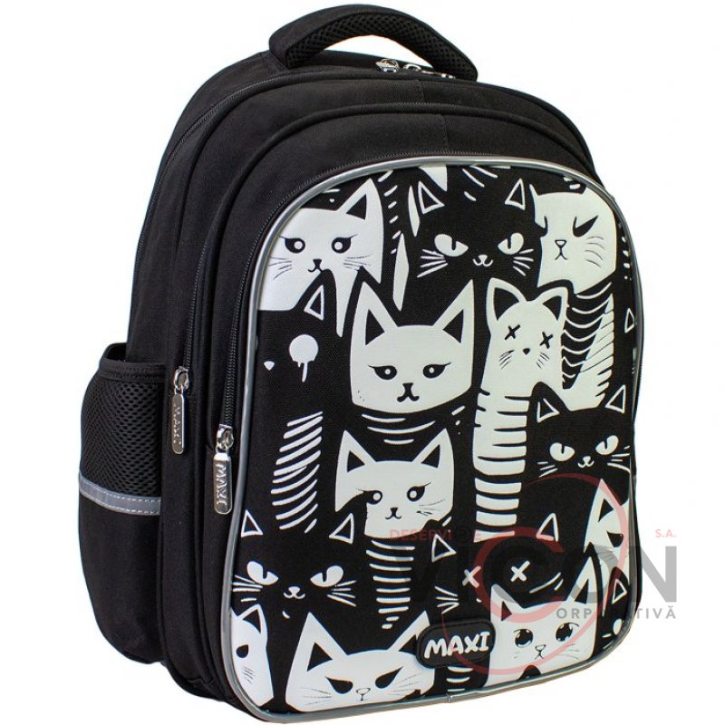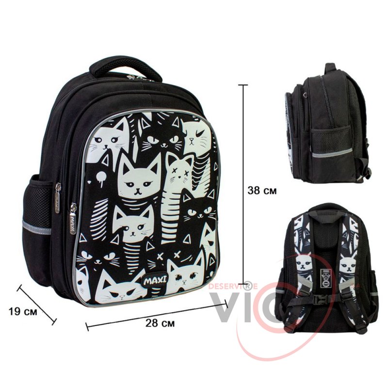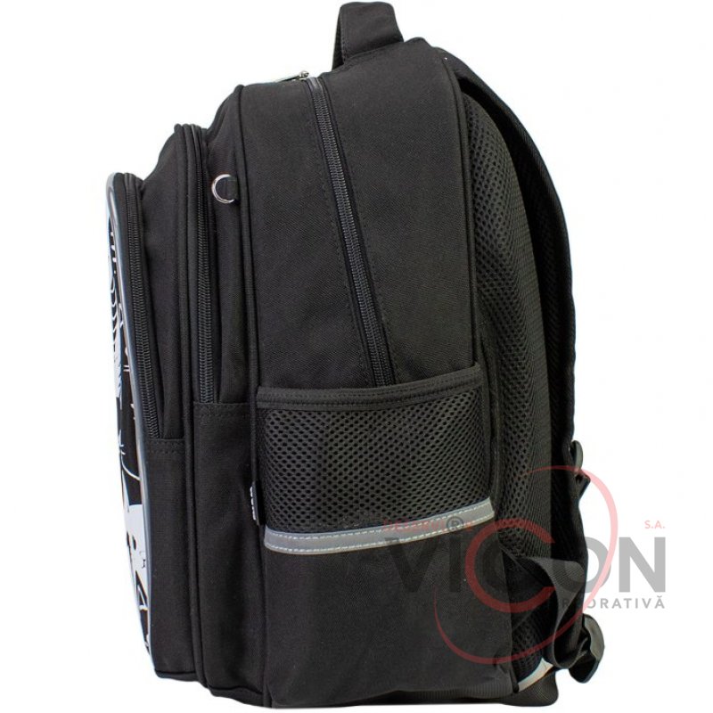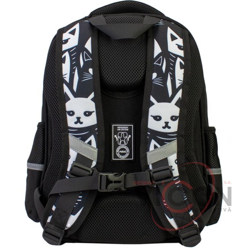 Рюкзак содержит: 3 основных отделения; 2 боковых кармана для бутылочки и зонтика; жесткая ортопедическая спинка; эргономические S-образные лямки; разделитель для книг с резинкой; ключница; нагрудный ремень для дополнительной фиксации; надежная фурнитура; светоотражающие элементы; крепкая ручка и ручка-петля; прорезиненное дно, кольцо для брелока.