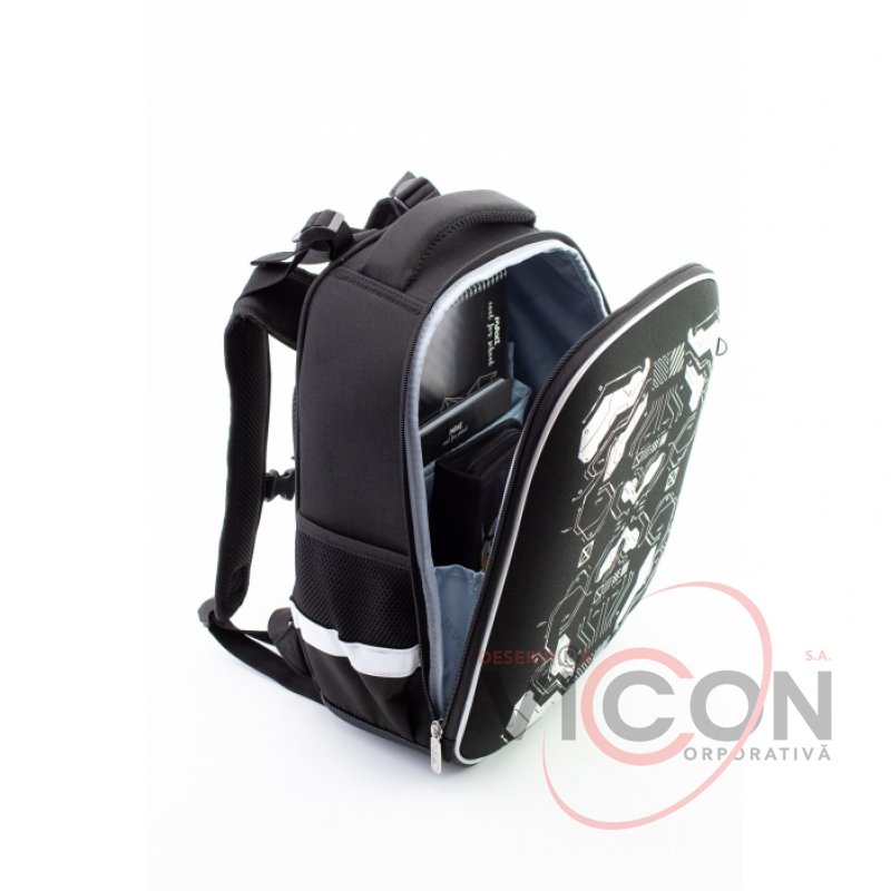 Рюкзак содержит: 1 основное отделение; 2 боковых кармана для бутылочки и зонтика; жесткая ортопедическая спинка; эргономические S-образные лямки; функциональный органайзер с резинкой и разделителями для книг; нагрудный ремень для дополнительной фиксации; надежная фурнитура; светоотражающие элементы; крепкая ручка и ручка-петля; прорезиненное дно с ножками.