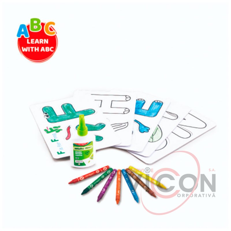 В комплекте 8 цветных мелков, а также карточки с рисунками и буквами для раскрашивания.