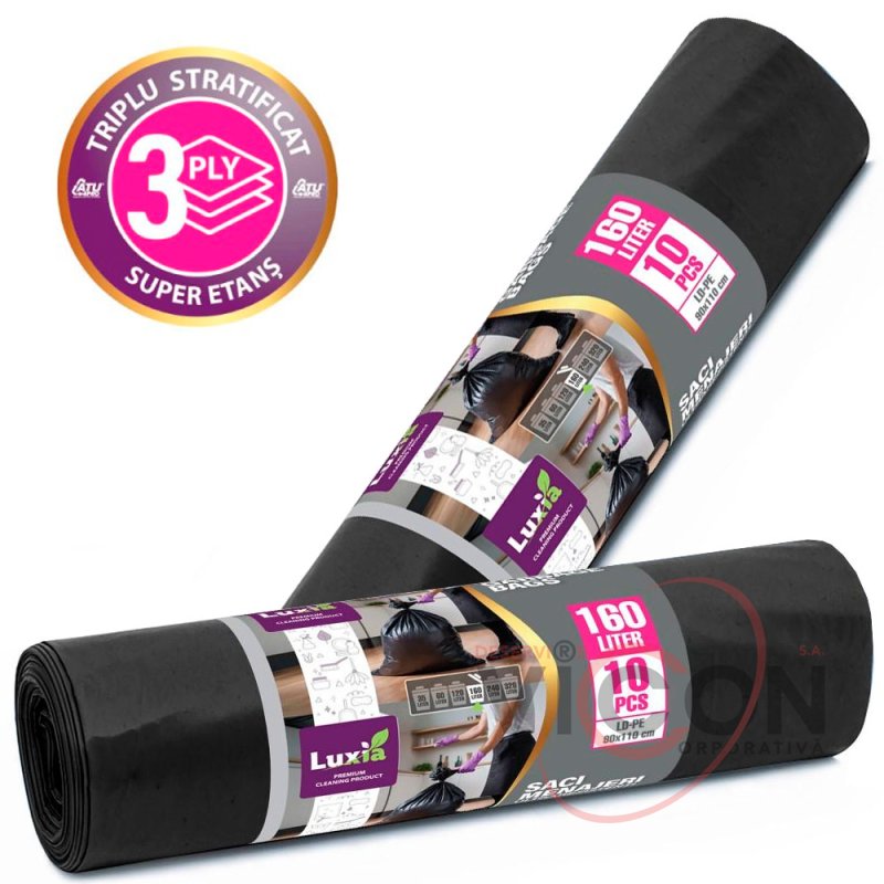 Мешки Luxia 160 литров 10 шт. из полиэтилена LDPE для тяжелых условий эксплуатации, идеально подходят для мест с большим количеством бытовых или промышленных отходов.