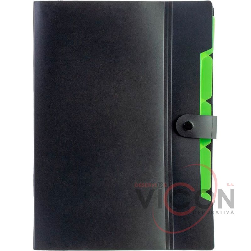 Папка на 6 отделений на кнопке с расширением A4, черная с салатовым