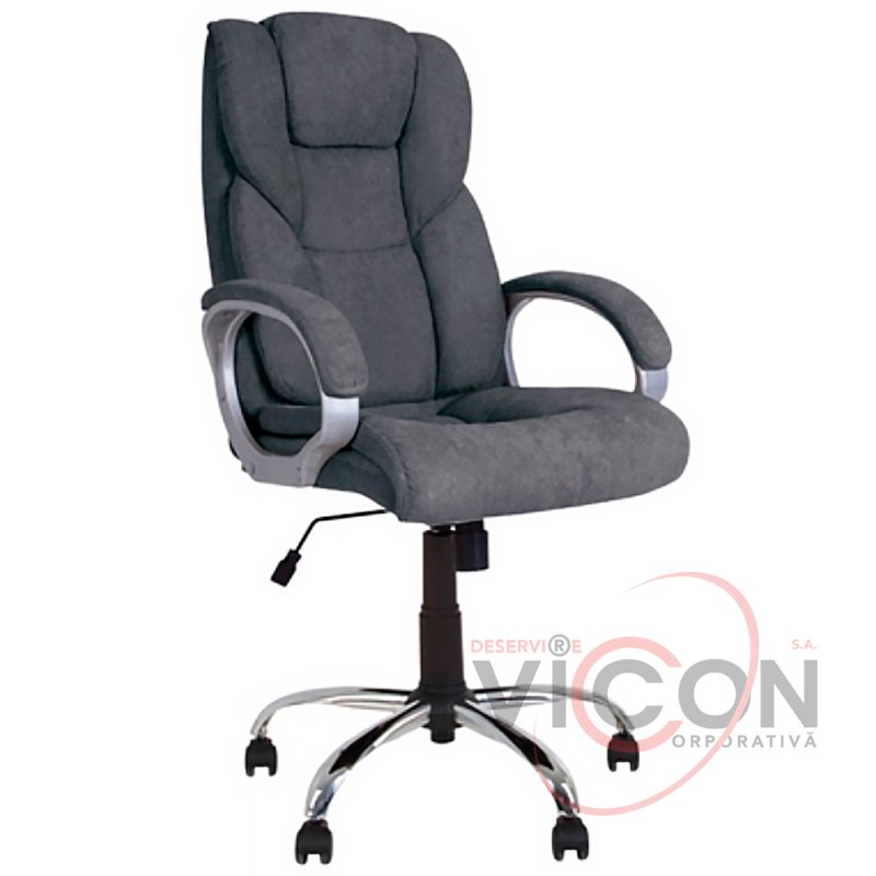 Кресло для руководителя Morfeo. Комфортная эргономика, достигаемая поролоновыми вставками чехла и профильной спинкой, "неплоский" (пухлый) внешний вид кресла в сочетании с оптимальной ценой. Пластиковые подлокотники с обитыми мягкими накладками. Хромированная металлическая база и пластиковые ролики.