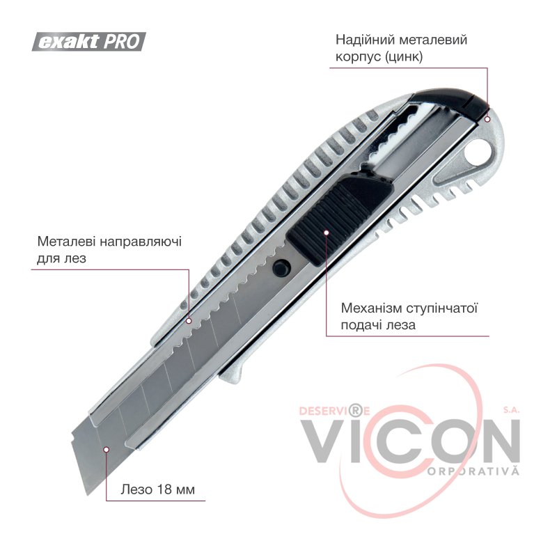 Нож канцелярский металлический (Al) Axent 6902-A имеет длину лезвия 18 мм. Надежный металлический корпус (алюминий). Металлические направляющие для лезвий. Механизм ступенчатой подачи лезвия. Блистерная упаковка.