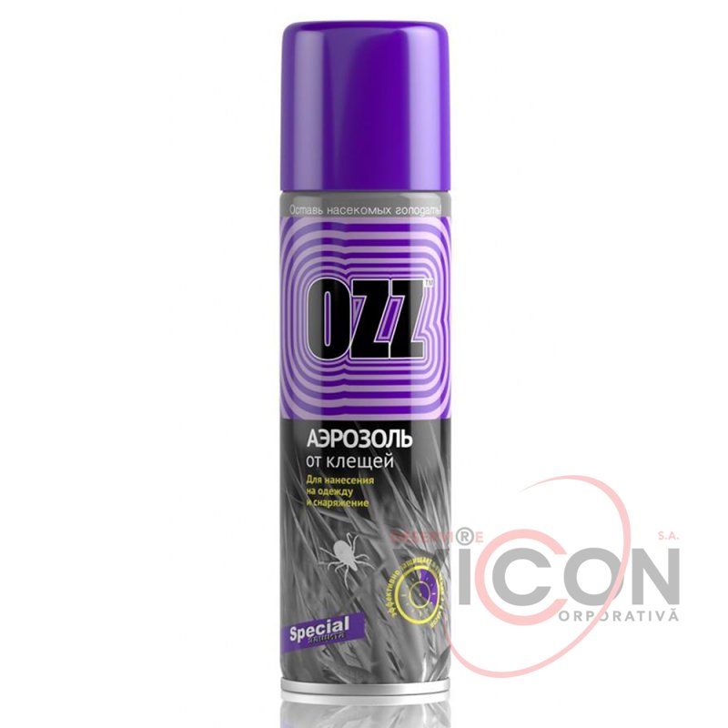 Аэрозоль «OZZ от клещей».Эффективно защищает не только от клещей, но и от других кровососущих насекомых (комаров, мошек, москитов, мокрецов) в течение 3-4 часов. Обладает приятным запахом лимона. Предназначен для нанесения на одежду и другие изделия из ткани. Не оставляет пятен на одежде.