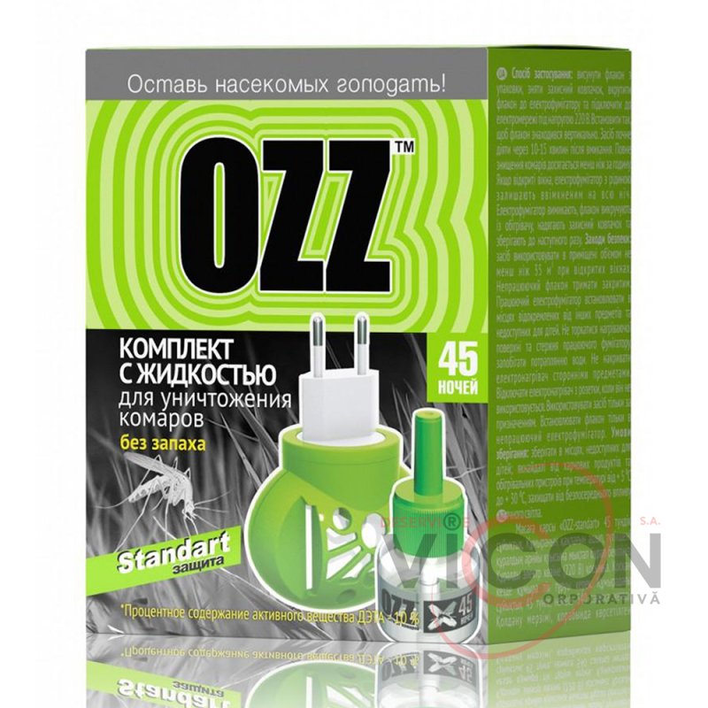 OZZ Standart Набор диффузор + жидкость от комаров 45 ночей, 30мл. Незаменимое средство в борьбе с комарами в помещениях. Начало действия — через 10-15 минут после включения. Полное уничтожение комаров достигается менее чем через 1 час. В состав продукта входит современное высокоэффективное активное действующее вещество.