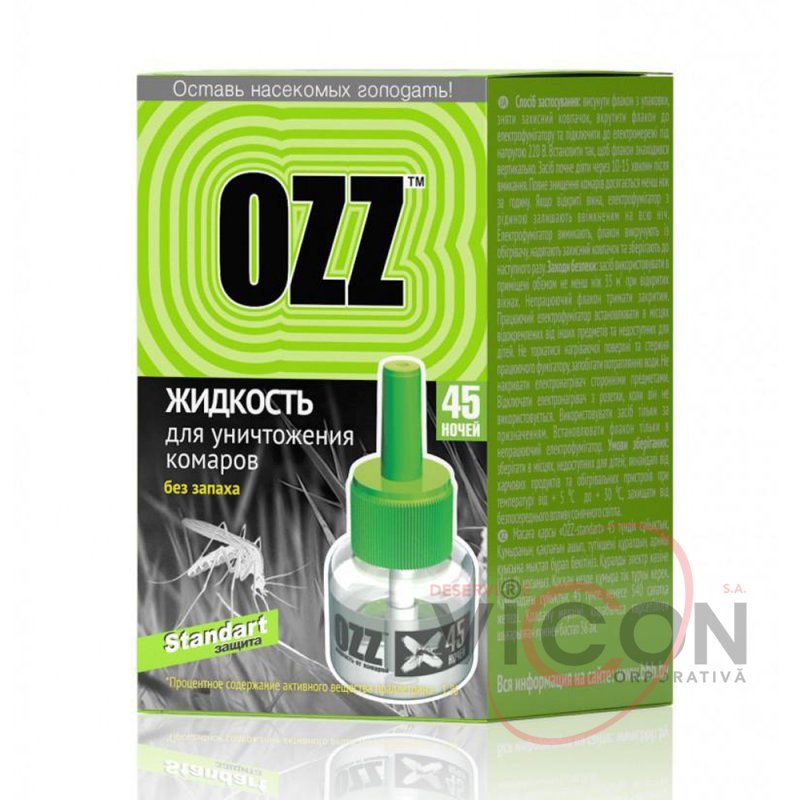 OZZ Standart Жидкость от комаров 45 ночей, 30мл.Незаменимое средство в борьбе с комарами в помещениях. Начало действия — через 10-15 минут после включения. Полное уничтожение комаров достигается менее чем через 1 час. В состав продукта входит современное высокоэффективное активное действующее вещество.