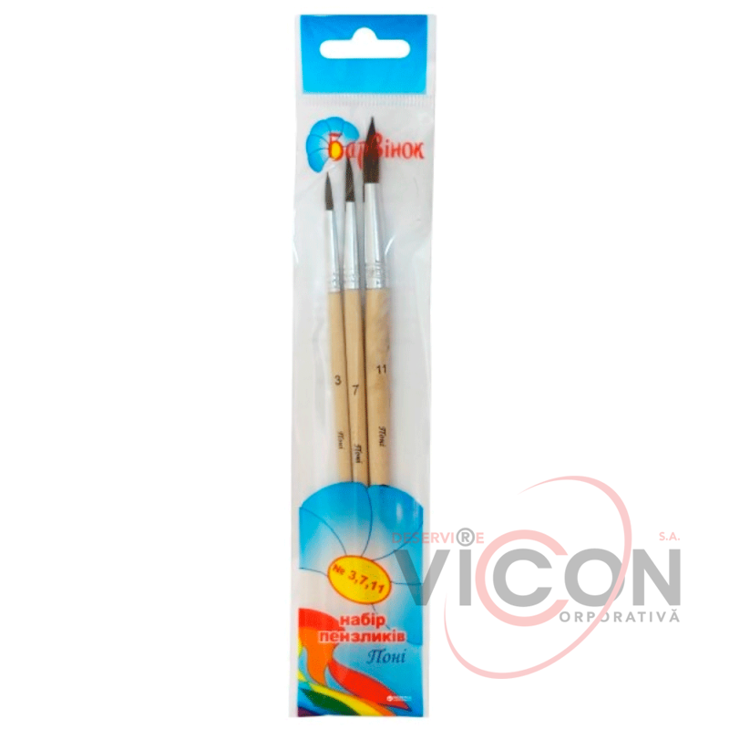 Набор кистей для рисования Барвинок предназначен для художественных и оформительских работ с водорастворимой краской: акварелью, гуашью или темперой. Набор состоит из круглых кистей разных размеров. Кисти из волос пони хорошо держат форму и впитывают краску. Упаковка полибега с подвесом. В набор входят 3 кисточки № 3, 7, 11