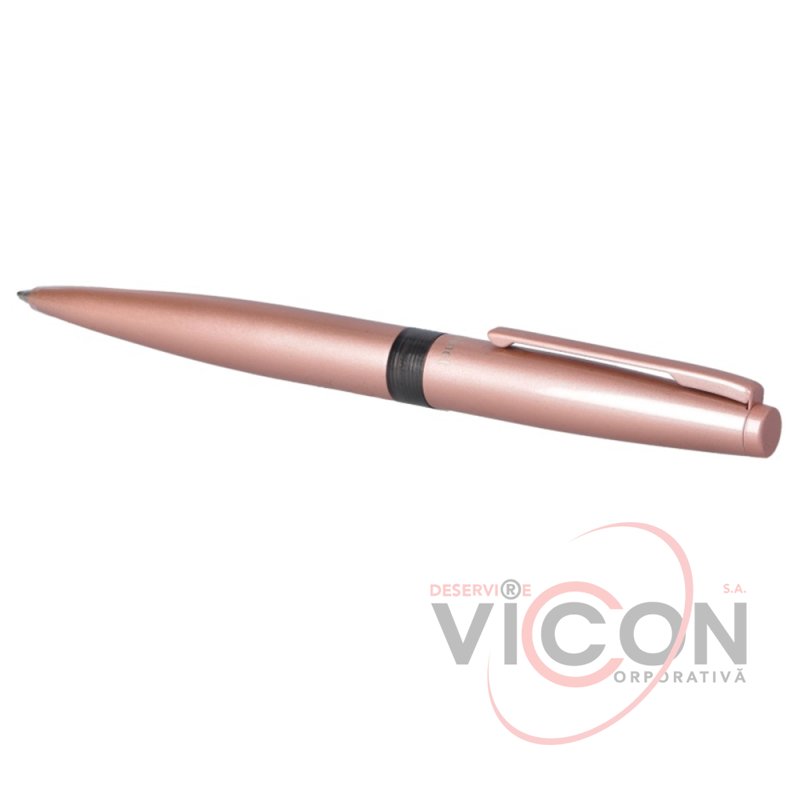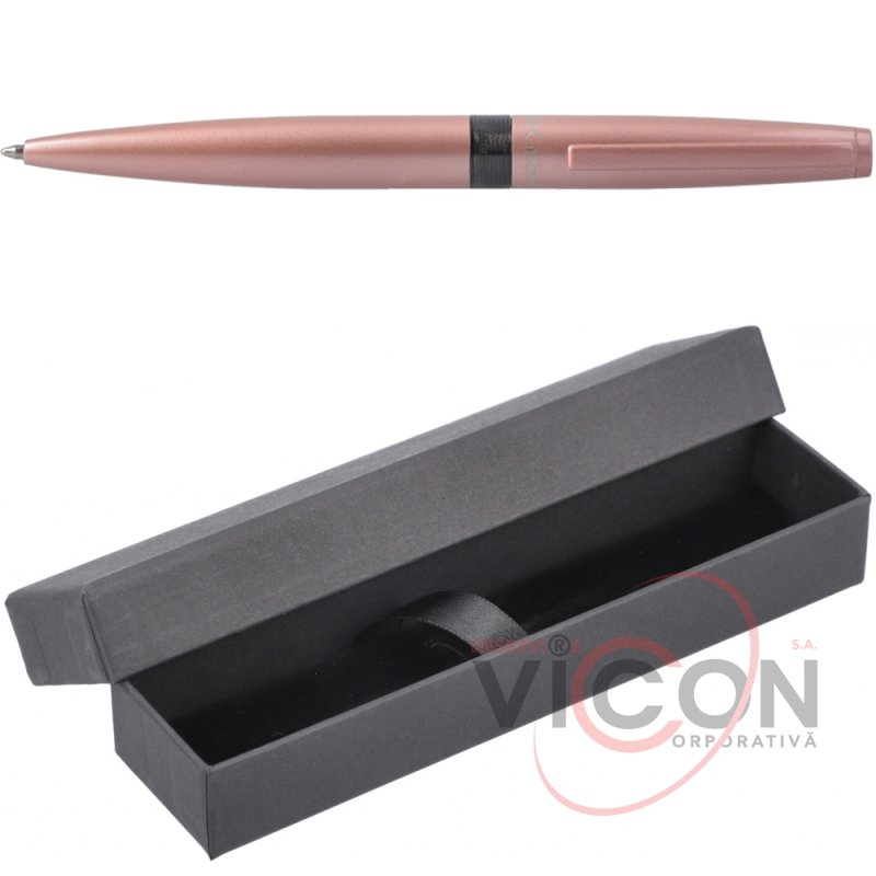 Шариковая ручка с поворотным механизмом; стержень – тип PARKER; пишет синим; длина ручки 14 см; металлический глянцевый оттеночный корпус розовое золото, делает ручку более привлекательной; в комплекте – подарочный футляр.