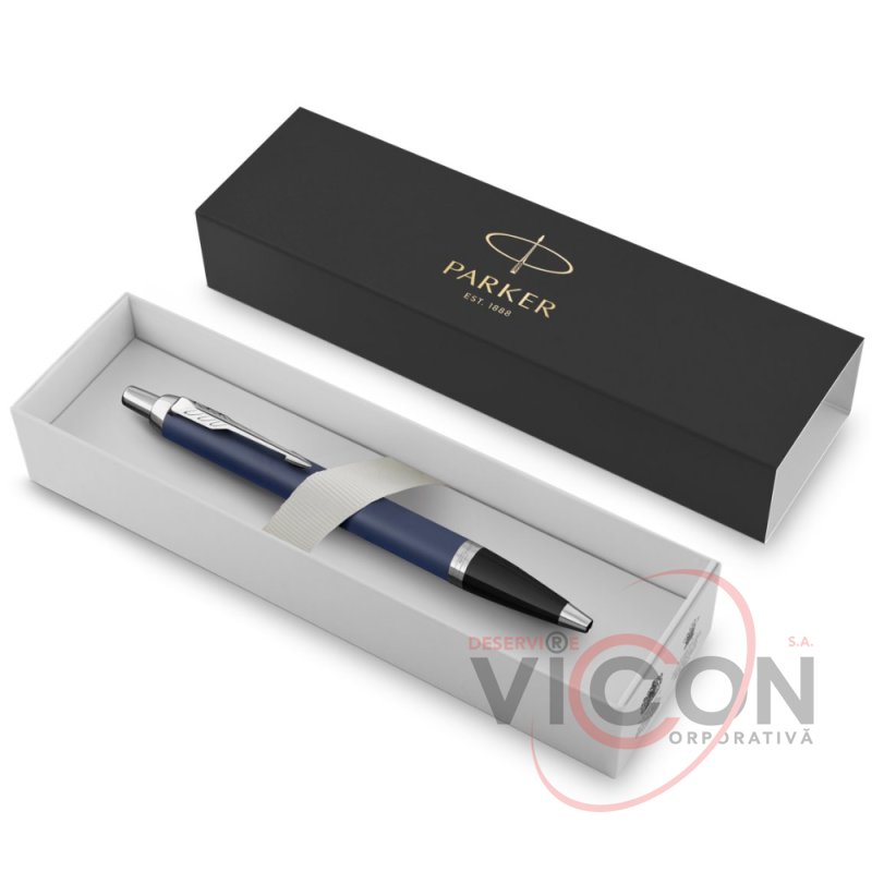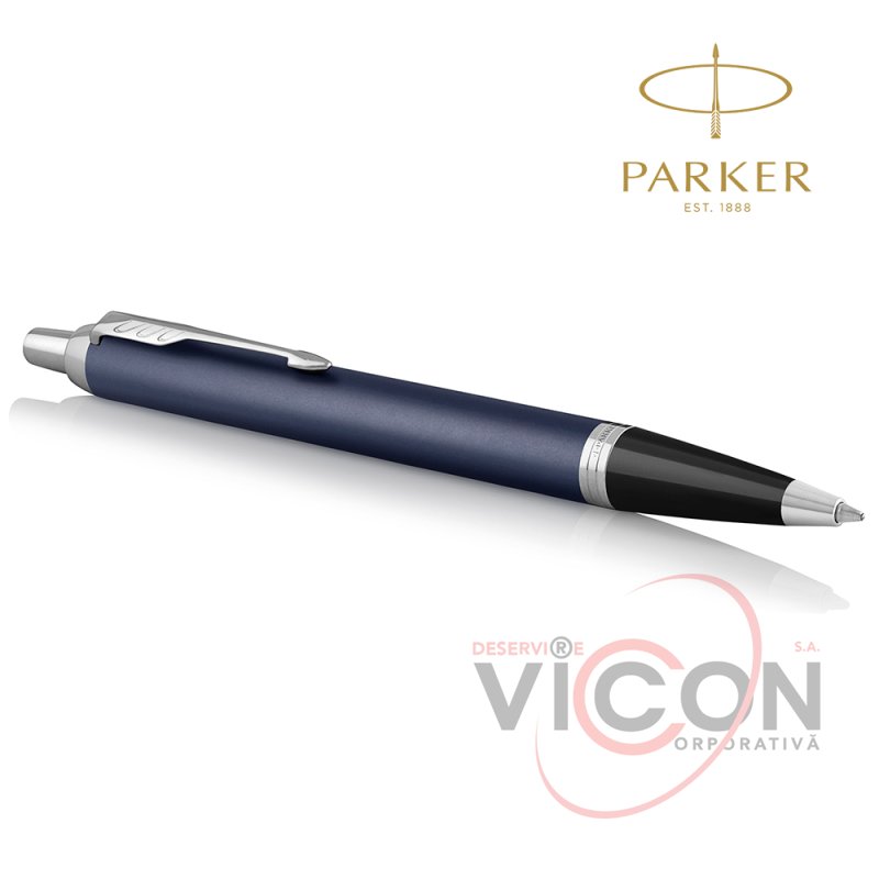 Модель 2017 года, шариковая ручка Parker IM Matte Blue CT из обновленной коллекции IM. Основные особенности нового дизайна: новый зажим-стрела с тремя широкими перьями, укороченная форма торца на колпачке, широкое кольцо на корпусе теперь состоит из 3 соединенных вместе колец, на среднем выполнена гравировка логотипа PARKER. Корпус шариковой ручки выполнен из латуни и покрыт матовым лаком темно-синего цвета, отдельные элементы дизайна покрыты хромом, зона захвата изготовлена из блестящего пластика. Ручка поставляется в престижной подарочной коробке с обновленным дизайном.