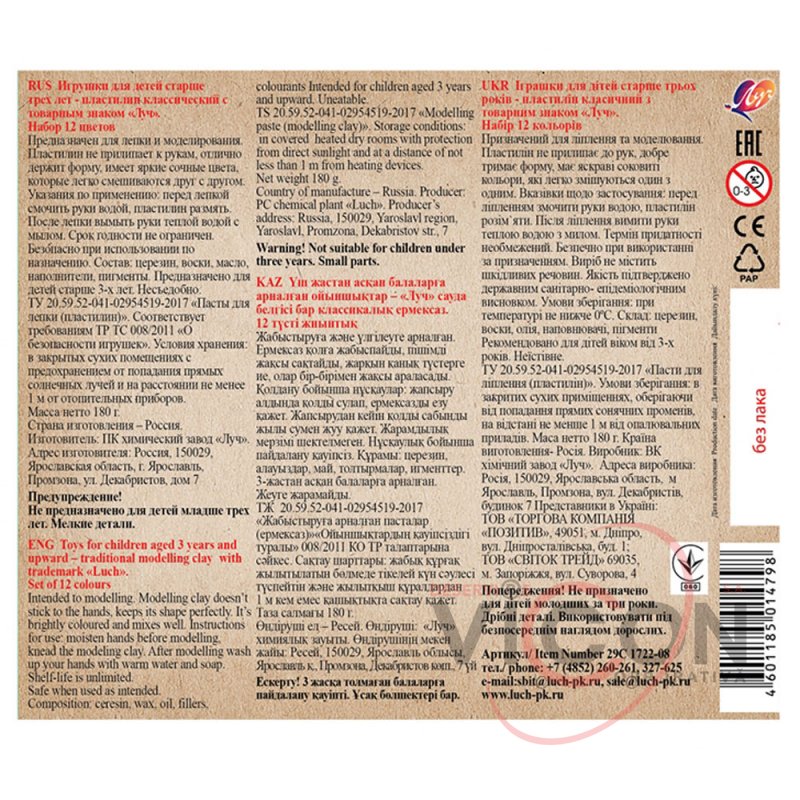 Набор пластилина упакован в картонную коробку.