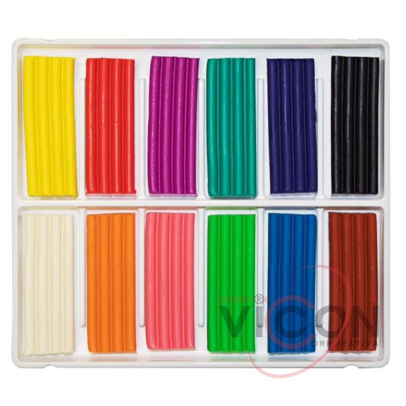 Цвета пластилина в наборе: белый, желтый, оранжевый, розовый, красный, светло-зеленый, изумрудный, синий, фиолетово-розовый, фиолетовый, красно-коричневый, черный.