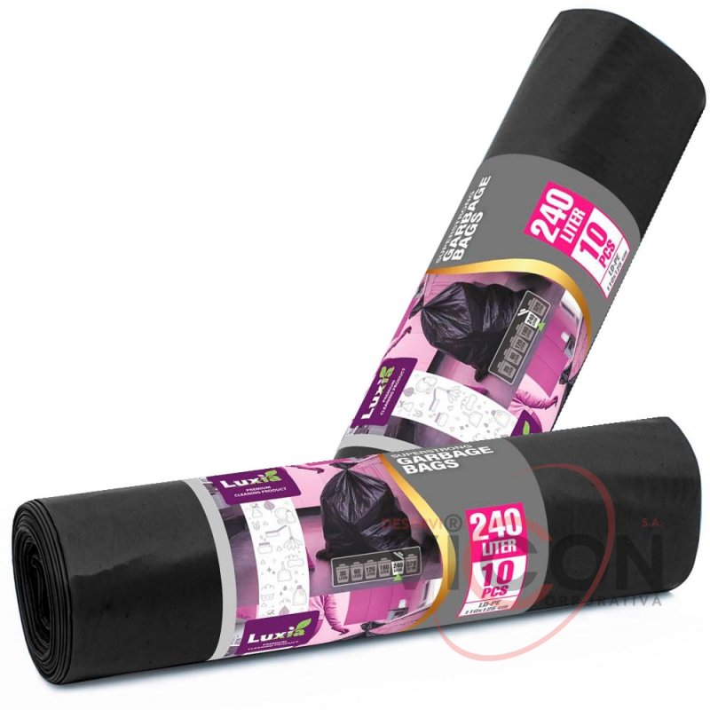 Мешки Luxia 240 литров 10 шт. из полиэтилена LDPE для тяжелых условий эксплуатации, идеально подходят для мест с большим количеством бытовых или промышленных отходов.
