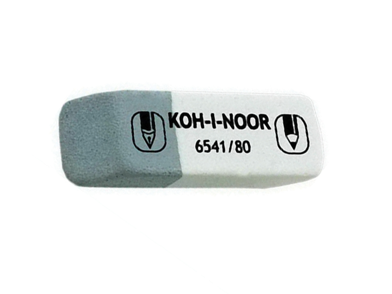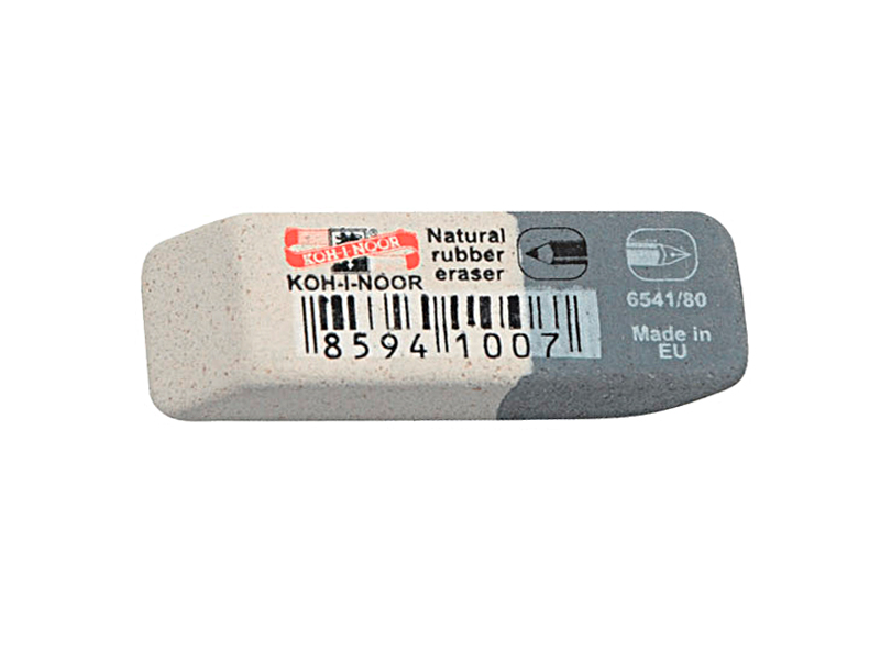 Комбинированный ластик из натурального каучука для широкого применения: белая сторона наилучшим образом удаляет след графитных карандашей твердости 8В-10Н, а серая - след чернил, туши, печатных машинок.