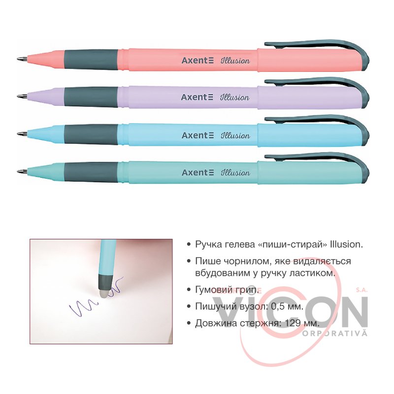 Ручка гелевая «пиши-стирай» Axent Illusion AG1094-02-A позаботится о том, чтобы в конспектах не было ни зачеркиваний, ни ошибок. Созданные с ее помощью надписи можно стереть в течение 12 часов специальным встроенным ластиком. А значит, в тетрадях всегда будет чисто и аккуратно.