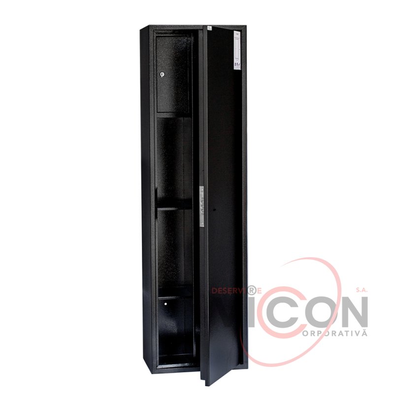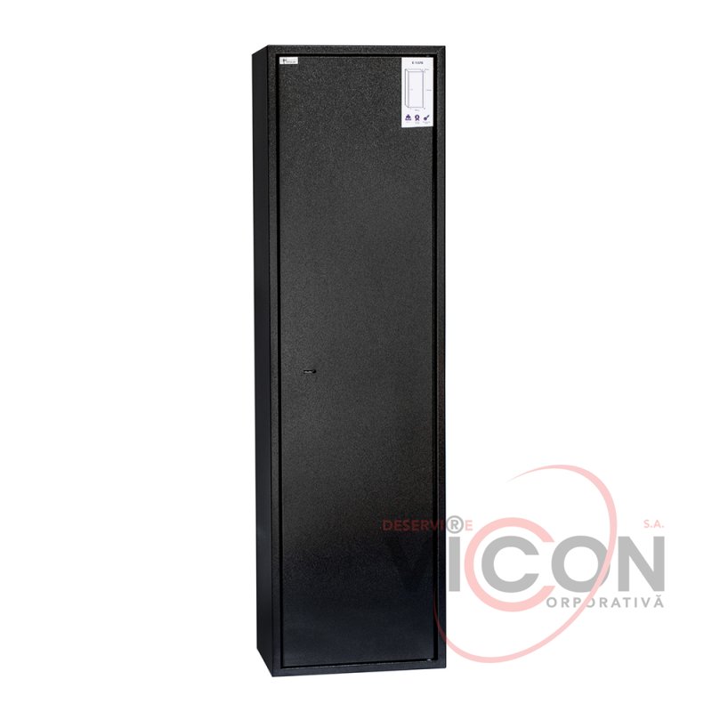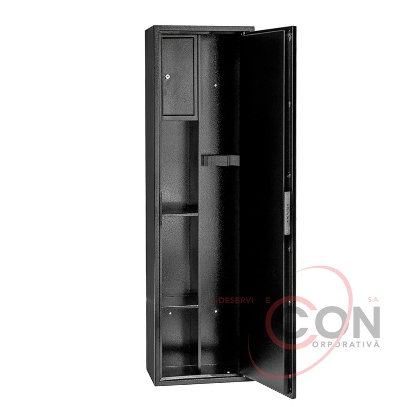 Сейф оружейный E-137K1 с ключевым замком предназначен для хранения 3-х единиц оружия длиной до 1350 мм. В сейфе расположен трейзер (касса) для хранения патронов и документов, две полки, ложементы. Анкерные узлы позволяют закрепить сейф к стене и полу, обеспечивая надежную фиксацию на стационарном месте.