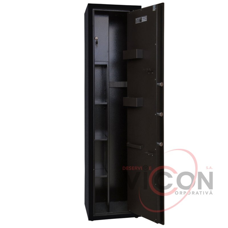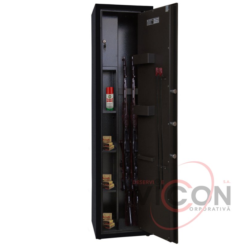 Сейф серии GS для хранения оружия имеет антивзломную конструкцию дверей (зацеп), петлю-антисрез, вертикальный трейзер (кассу) увеличенной емкости с полкой для хранения патронов и три съёмные полки для оружейных аксессуаров или документов, карманы для размещения средств по уходу за оружием или магазинов, держатели и фиксатор под шомполы, планку для навески. Сейф укомплектован передвижным магнитным ложементом.