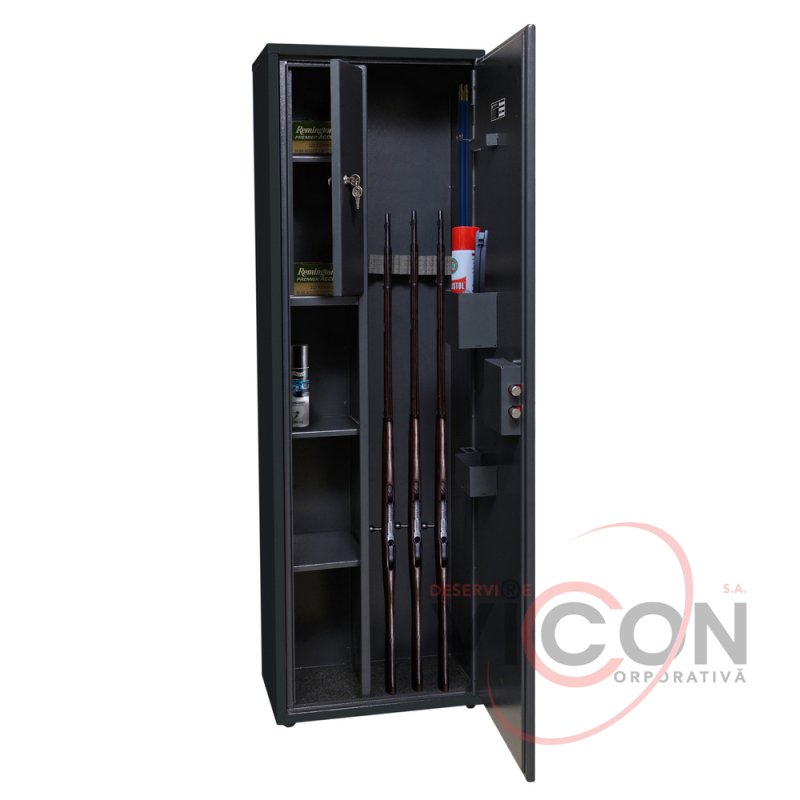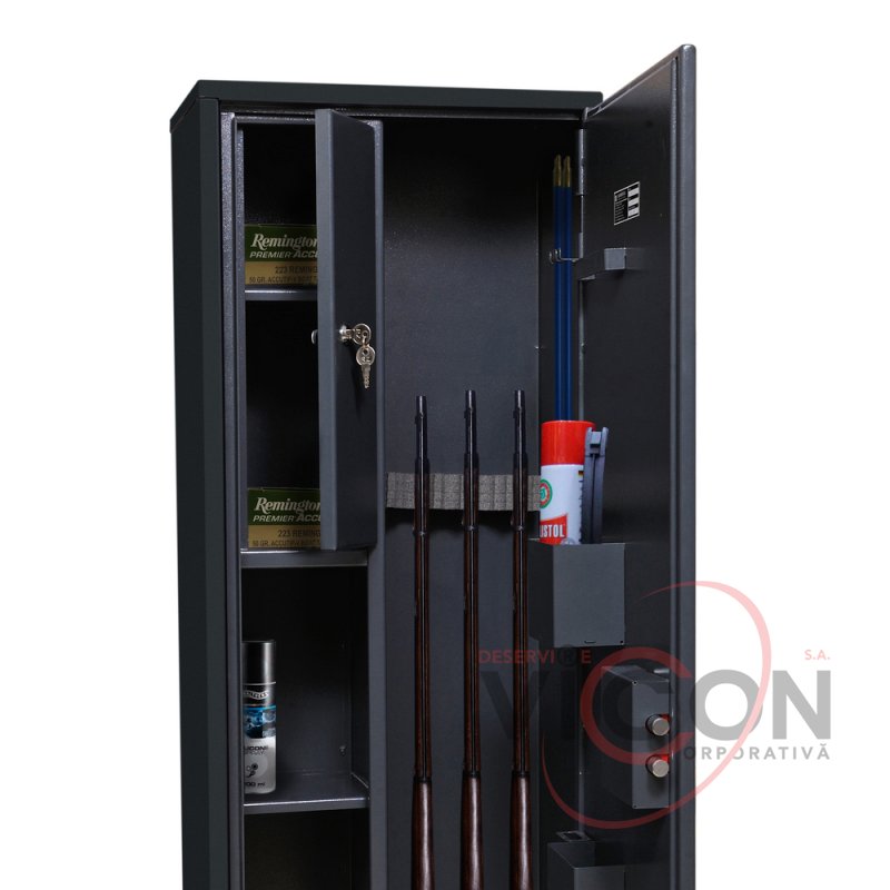 Сейф серии GL для хранения оружия GLST.130.K имеет противовзломную конструкцию дверей, вертикальный трейзер (кассу) увеличенной емкости с полкой для хранения патронов и документов, карманы для размещения средств по уходу за оружием или магазинов, держатели и фиксатор под два шомполы, планку для навески. Сейф укомплектован передвижным магнитным ложементом.