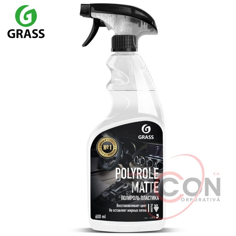 Профессиональный матовый полироль Grass «Polyrole Matte» для обработки приборных панелей, неокрашенных бамперов, покрышек, для очистки и полировки изделий из кожи, дерева винила, пластика и резины, не оставляет жирных пятен, препятствует оседанию пыли придает матовый блеск, обладает приятным ароматом.