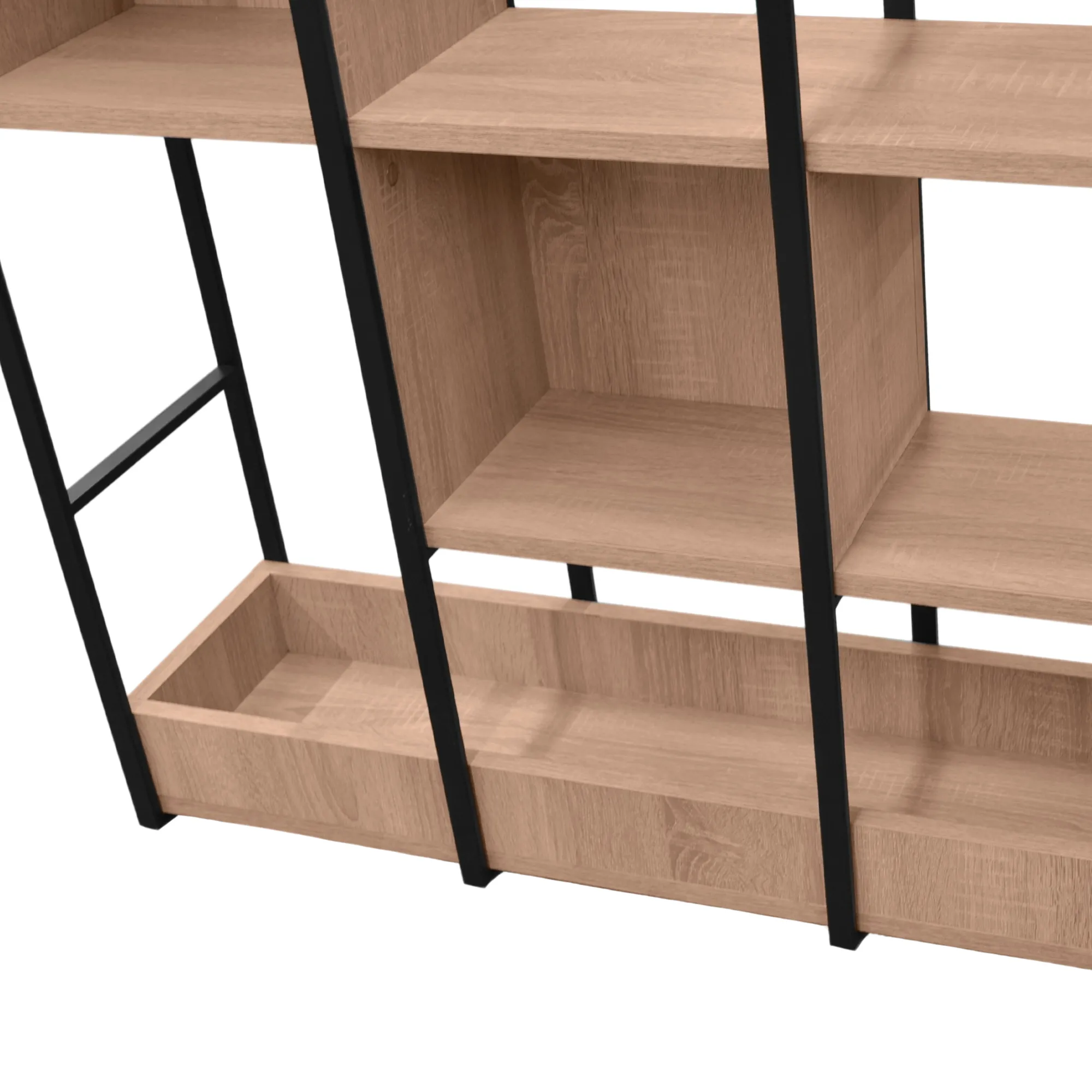 Полка имеет 5 открытых полок для хранения товаров и материалов, таких как картриджи, чернила, бумага и канцелярские принадлежности.