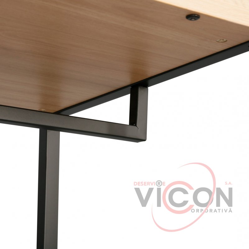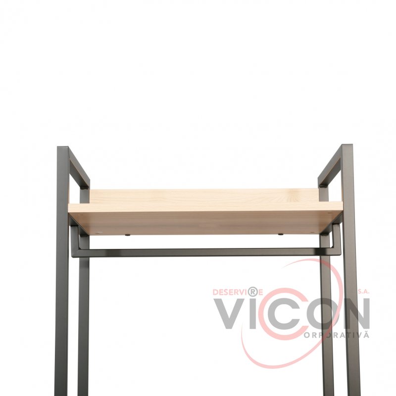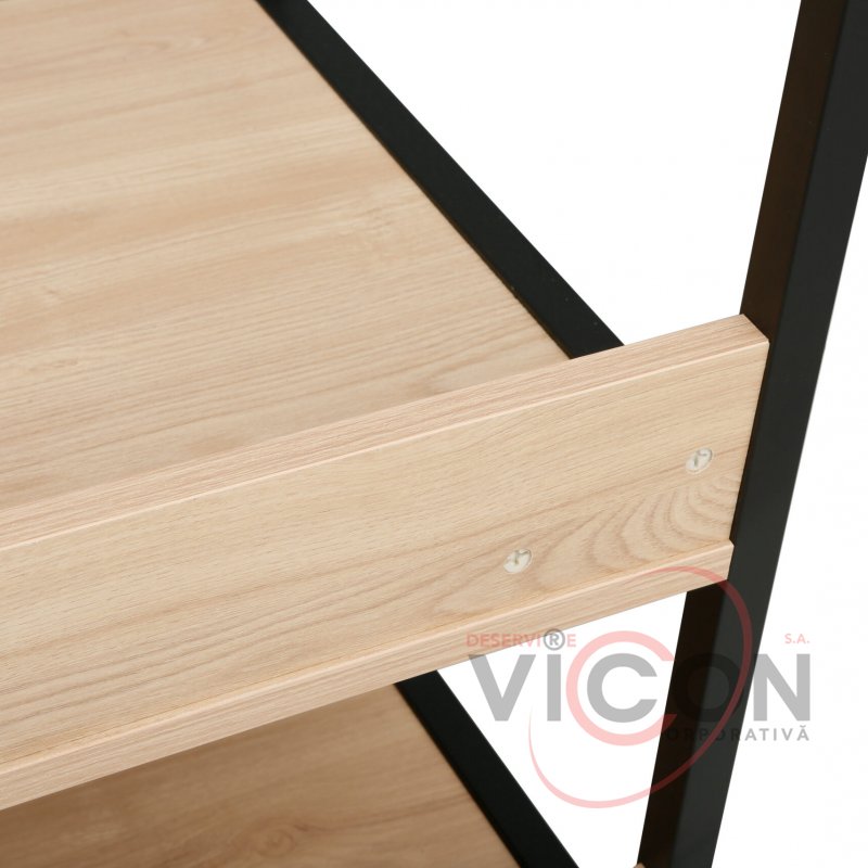Её конструкция выполнена из сварного металла, окрашенного методом порошкового напыления, что обеспечивает отличную устойчивость и высокую долговечность при ежедневном использовании.Столешница и полки изготовлены из ламинированного ДСП с отделкой «Дуб M37», придающей натуральный и тёплый вид, идеально подходящий для современных интерьеров.