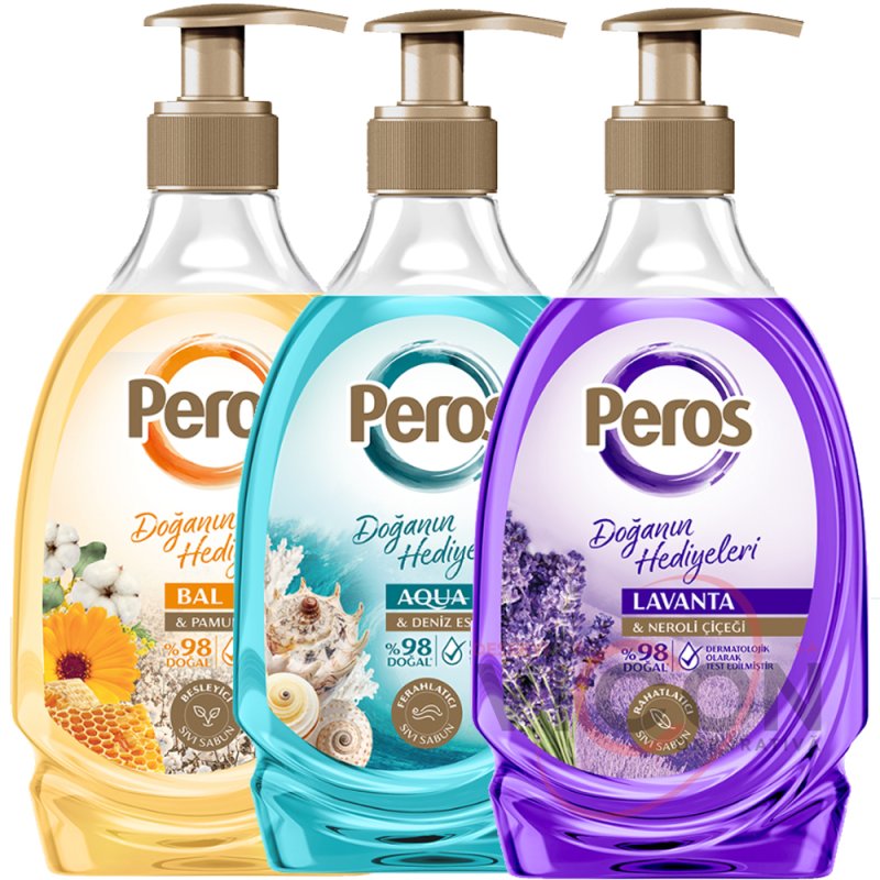 Новая серия жидкого мыла Peros, которая объединяет вашу кожу с дарами природы благодаря своему натуральному содержанию, заботится о вашей коже во время ее очистки. Жидкое мыло Peros — это решение для всех ваших потребностей в гигиене благодаря ассортименту увлажняющих, расслабляющих, освежающих, питательных, освежающих и антибактериальных продуктов.